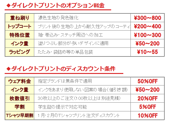 ダイレクトプリントの料金につきましては、下記料金が基準となります。