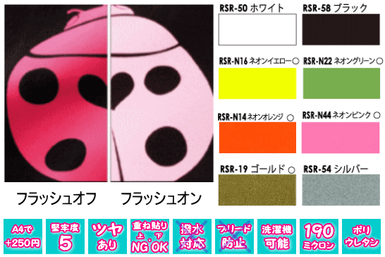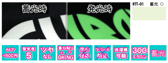 ■光を吸収することにより暗闇において光を発するメディアです。子供の運動着、カバン、ジャンパー、消防服、警備服などに転写して事故防止などに役立つメディアです。